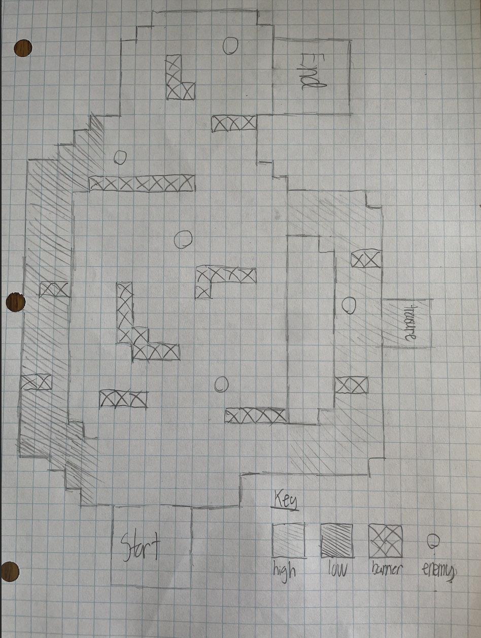 I had a few players jump on top of the barriers meant for hiding. Because they were on top of them, the enemies were unable to reach and attack players. After discovering this, I made the barriers thinner, that way players could still jump over them, but could not stand on top of them to avoid being attacked. I also received feedback that players wanted taller hiding spots so that they could stand behind them and not just crouch. I also added more L shaped barriers that way players could hide in corners to better avoid enemy detection.