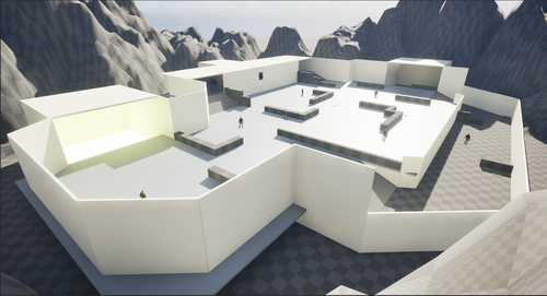 While this is only the blockout, my goal is to create an outdoors environment that takes place in the ruins of an ancient civilization. For this reason, there is only a roof in a few areas while most of it remains uncovered.